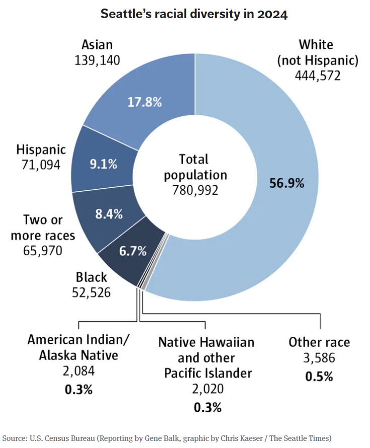 시애틀의 인종 구성이 빠르게 변화하고 있다. 아시아계 인구가 크게 늘면서, 현재의 증가세가 지속될 경우 향후 10년 내 단일 인종이 다수를 차지하지 않는 도시로 전환될 가능성이 거론된다.