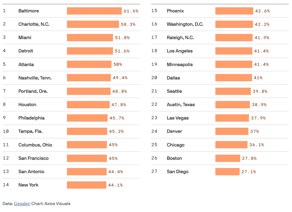 이번 조사에서 시애틀은 27개 도시 중 21위로, 이주 의향 비율이 비교적 낮은 편에 속했다. 가장 높은 도시는 볼티모어였으며, 뒤이어 샬럿(약 58%), 마이애미(52%), 디트로이트(52%) 순이었다.